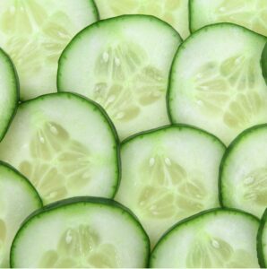 O pepino é rico em vitaminas A, C, E, minerais e antioxidantes que fortalecem a barreira de umidade natural da pele, aliviam vermelhidões, inchaços e a sensação de queimadura solar.