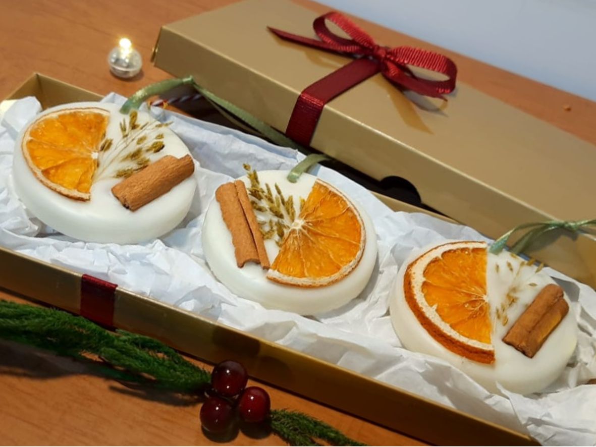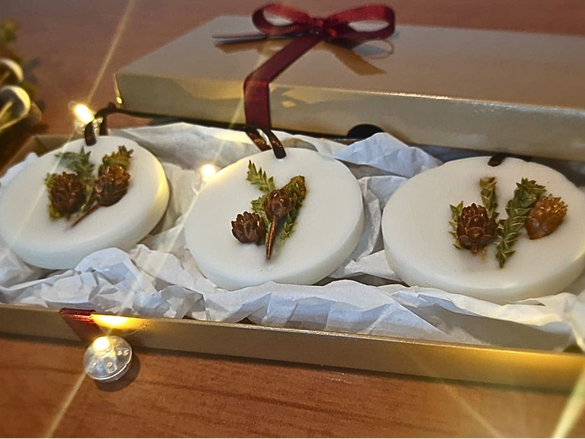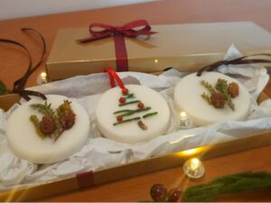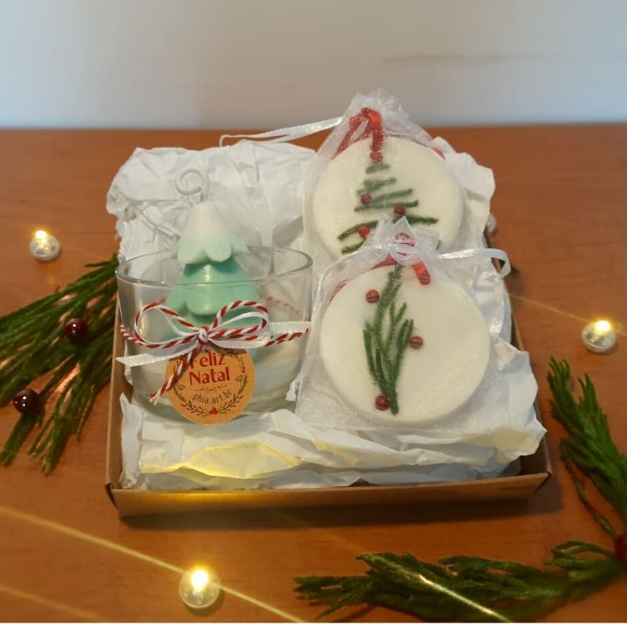 Duas pastilhas e uma vela com design natalino, feitas com cera de coco.